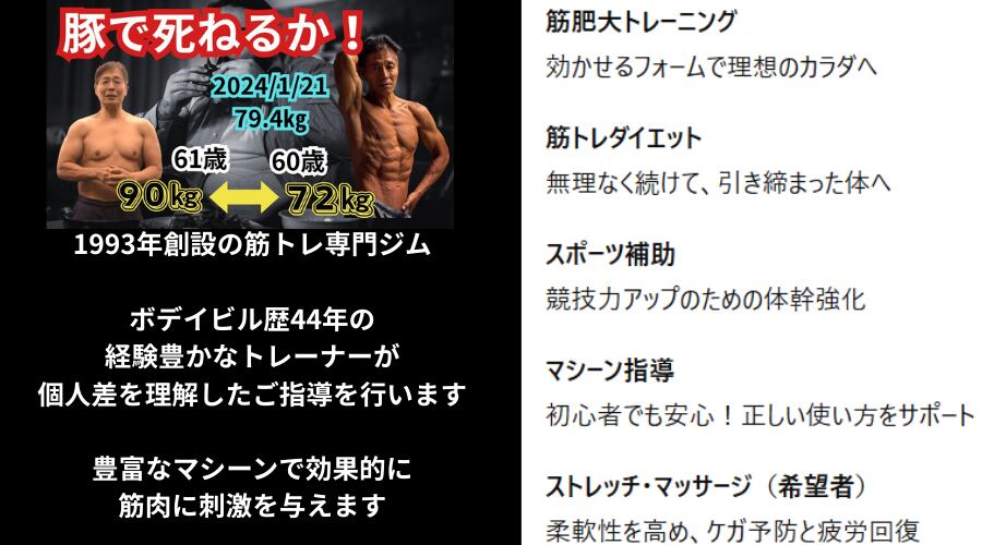 1993年創設の筋トレ専門ジムで、ボディビル歴44年の経験豊かなトレーナーが指導を担当。